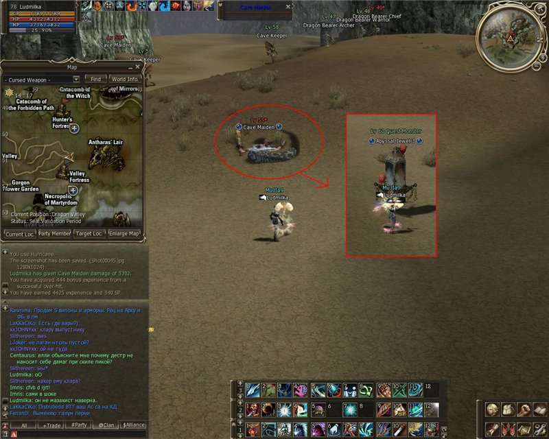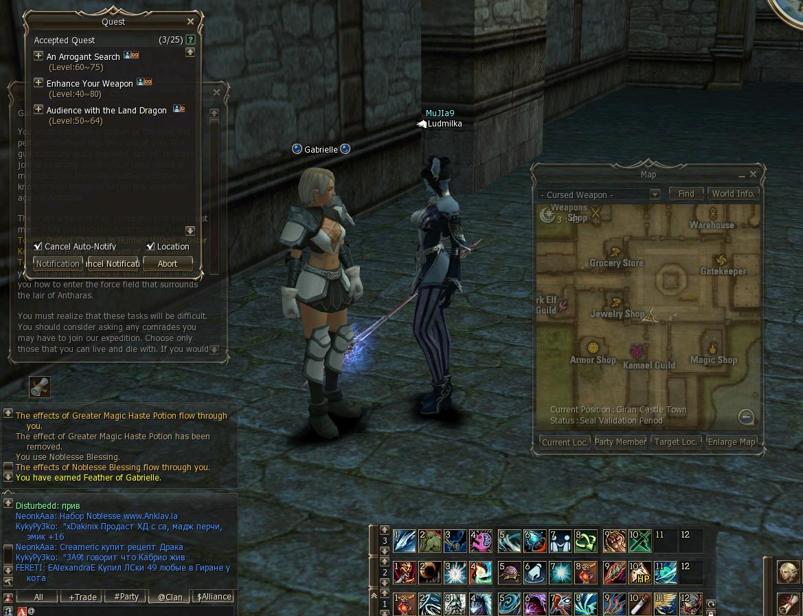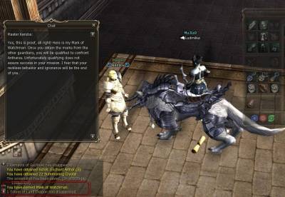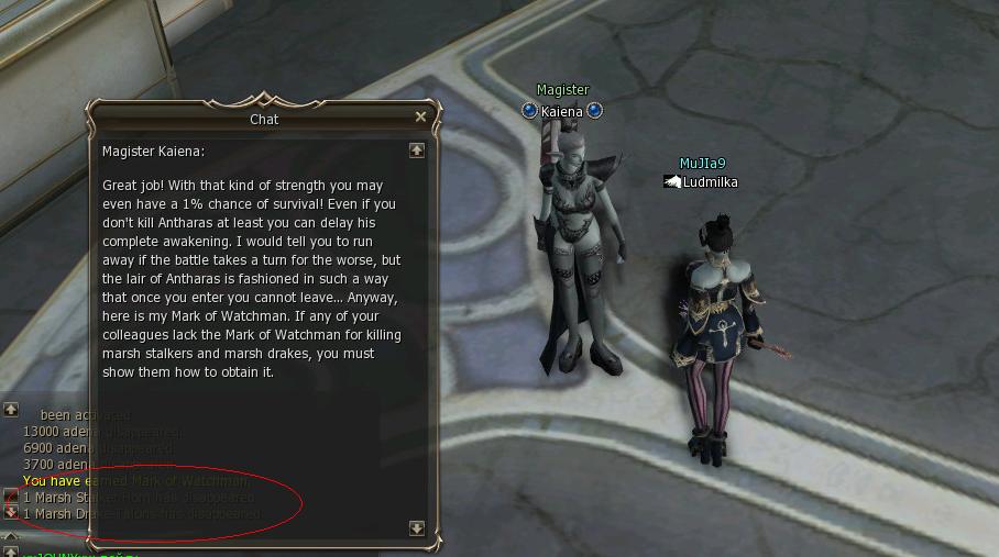Стартовая область: Giran Castle Town Стартовый NPC: Seal Guardian Gabriel Награда: Portal Stone Повторение: Да 1. Идем в Гиран и ищем Seal Guardian Gabriel в Гиране. Получаем квест. Теперь нам надо побывать у четырех НПС. 2. Телепортируемся в Ivory Tower, оттуда на четвертый этаж в Гильдию Темных Эльфов. Находим Magister Kaiena. Отправляемся убивать Marsh Stalker и Marsh Drake в Forsaken Plains, пока не получим 1 Stalker Horn и 1 Drake Talon. Возвращаемся к Magister Kaiena, получаем Mark of Watchman. 3. Телепортируемся в Аден. Находим High Priest Orven в Адене, он находится в храме Адена. Телепортируемся в Forbidden Gateaway и убиваем Bloody Queen. Вскоре появятся Sacrifice of Sacrificed. Убиваем их и получаем Remains of Sacrificed. Возвращаемся к High Priest Orven и получаем Mark of Watchman. 4. Тут же в Адене ищем Master Kendra. Она отправит убивать Harit Lizardman Shaman и Harit Lizardman Matriarch в Anghel Waterfall. Появятся Harit Lizardman Zealot, с которых получаем Totem of Land Dragon. Возвращайтесь к Master Kendra и получаем Mark of Watchman. 5. Делаем ТП и оказываемся в Hunter Village. Находим Prefect Chakiris. От него идем в The Giants Cave. Убиваем Kranrot и Hamrut и получааем 1 Hamrut Leg и 1 Kranrot Skin. Возвращаемся к Prefect Chakiris и получаем Mark of Watchman. 6. Идем к Seal Guardian Gabriel в Гиран. Нас пошлют еще к двум НПС. Возвращаемся к Warehouse Chief Moke и получаем Mark of Watchman. Возвращаемся к Blacksmith Helton и получаем Mark of Watchman. 11. Что бы появился Abyssal Jewel 3 надо поубивать Cave Keeper и Cave Maiden в возле входа в пещеру антараса. Появится Abyssal Jewel 3 с охранниками. Сначала убиваем Abyssal Jewel 3. если убить сначала охранников, Abyssal Jewel 3 исчезнет. Получаем Abyss Fragment. Идем к Eternal Watchman of Antharas Theodric, который находится у входа в Antharas Lair. Получаем Portal Stone. Все, можно ходить на танцы к Антарасу. | |
