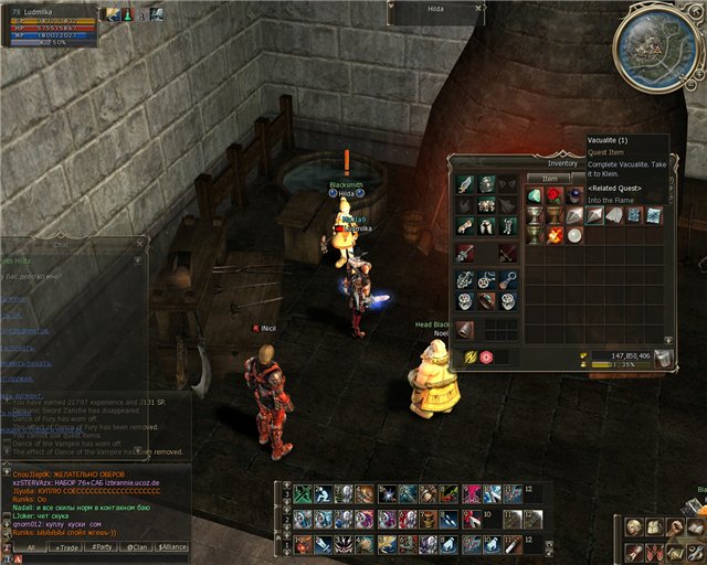 Стартовая область: Forge of the Gods Стартовый NPC: Kleina Награда: Floating Stone Повторение: Да Важно: Несмотря на начальный уровень квеста его не стоит выполнять без хай-левел пати или по крайней мере без Spectral Dancer 77 лвл. 1. Телепортируемся из Goddard в Entrance To The Forge of the Gods. Заходим в пещеру и идем вниз. Здесь вам понадобится Spectral Dancer или саммонер к клейну. Переходим мост, затем идем на налево, далее все время направо. Находим Kleina. Разговариваем, получаем квест. 2. Klein попросит принести ему Vacualite от Blacksmith Hilda в Goddard. С помощью этого ингредиента Klein сможет сделать Floating Stone для прохода к Валакасу. 3. Поговорите с Blacksmith Hilda в годдарде в . Она попросит принести Vacualite Ore. Идем охотиться в Garden of Wild Beasts на мобов: Kookaburra, Bandersnatch и Grendel,проще их найти на выходе из годдарда, и охотимся пока не получим 50 Vacualite Ore. 4. Возвращаемся к Blacksmith Hilda. Получаем Vacualite. Идем к Klein в Forge of the Gods. 5. Поговорите с Klein. Он заберет у вас Vacualite и сделает Floating Stone. Теперь вы можете навещать Валакаса. Приятного чаепития! | |